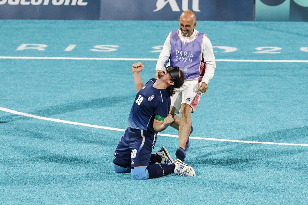 Photo Description: Frederic Villeroux of France celebrates the winning penalty with his guide Yannick le Colvez